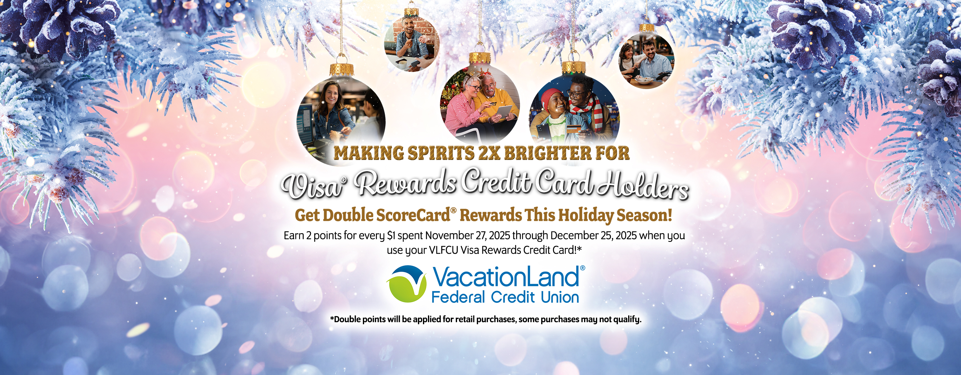 Earn 2 points for every $1 spent November 27, 2025 through December 25, 2025 when you use your VLFCU Visa Rewards Credit Card!* Make the holidays brighter with toys, clothes, electronics and other qualifying purchases while you earn points for yourself that can be redeemed for cash back, gift cards, Cedar Point passes, and merchandise. Don’t have a VLFCU Visa Rewards Credit Card? Apply today!