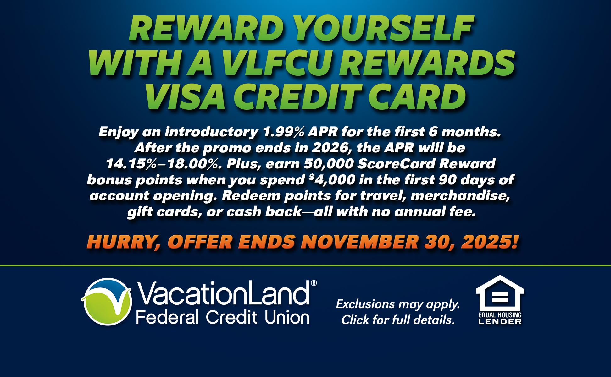Membership eligibility is required with a minimum deposit of $5.00 in a Share/Savings Account. Member must be in good standing with VLFCU. No promotions are eligible with any other offer or discounts. 1. APR= Annual Percentage Rate. 2. Introductory rate of 1.99% APR applies for six months after you open the VLFCU Visa. After the introductory period ends, the APR will be (Prime + 6.90% to Prime + 17.90% as published in the Wall Street Journal), based upon your creditworthiness. APR may vary but will not exceed 18%. Foreign transaction fees up to 1% of each transaction amount applies to purchases made outside of the U.S., regardless of whether you are located inside or outside the United States at the time of the transaction. You will qualify for 50,000 ScoreCard Reward bonus points if you use your new Visa card to make any combination of purchase transactions totaling at least $4,000 (exclusive of any balance transfers, cash advances, transaction fees, returns, adjustments or other cash equivalent purchases such as money orders, gift cards or prepaid cards) that post to your account within 90 days of the account open date. Bonus Points can be redeemed for cash back via a statement credit, gift cards or merchandise (50,000 points are estimated to be $400 in cash value). Earned points are redeemable only through the Scorecard Rewards point redemption website. Please allow up to 12 weeks after the 90-day period for the 50,000 points to post to your rewards balance (no later than 3/31/2026). Limit of one promotional offer at account opening. Offer valid for accounts opened between 10/15/2025 and 11/30/2025. Subject to change or cancellation without notice.