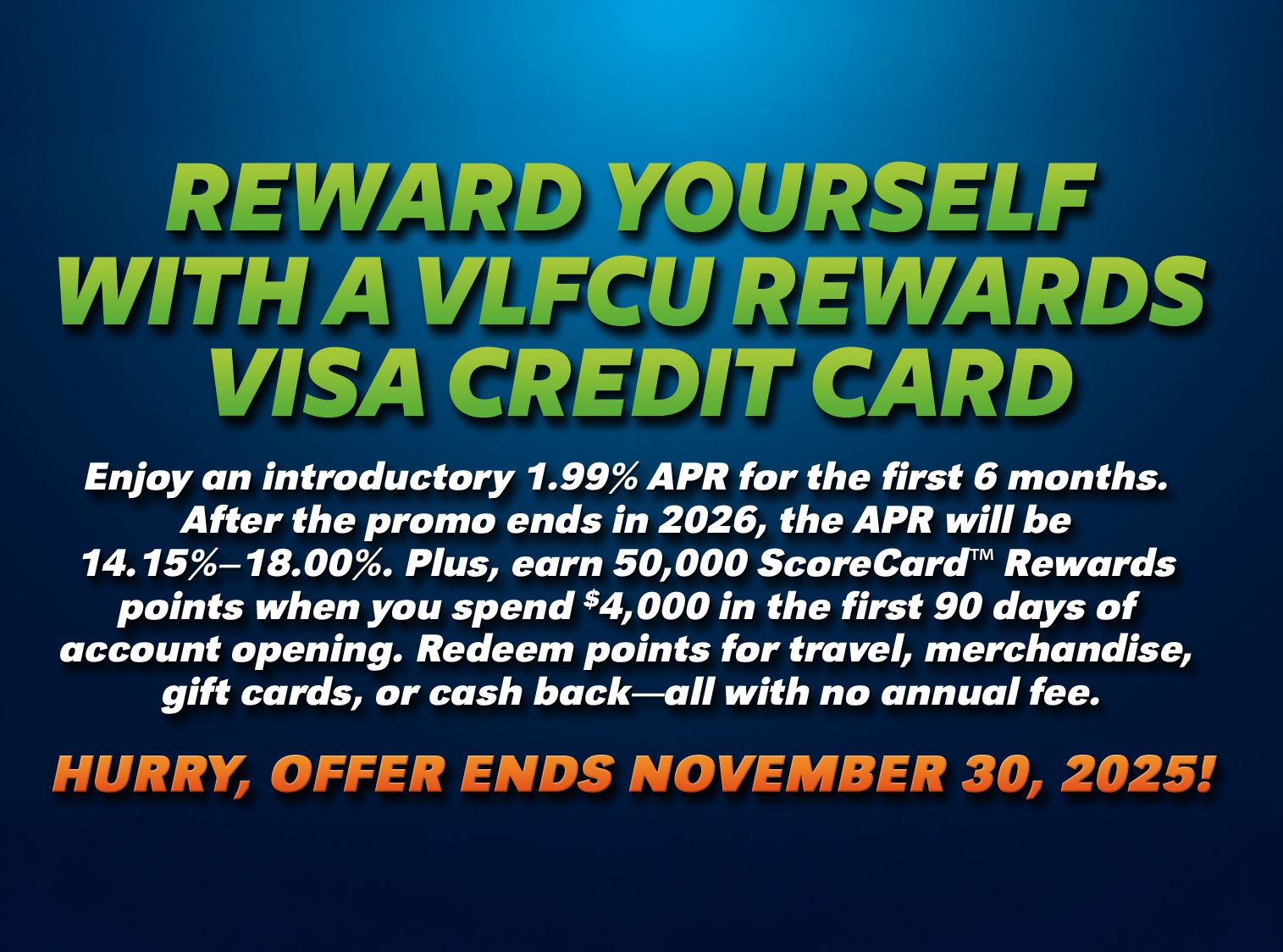 Membership eligibility is required with a minimum deposit of $5.00 in a Share/Savings Account. Member must be in good standing with VLFCU. No promotions are eligible with any other offer or discounts. 1. APR= Annual Percentage Rate. 2. Introductory rate of 1.99% APR applies for six months after you open the VLFCU Visa. After the introductory period ends, the APR will be (Prime + 6.90% to Prime + 17.90% as published in the Wall Street Journal), based upon your creditworthiness. APR may vary but will not exceed 18%. Foreign transaction fees up to 1% of each transaction amount applies to purchases made outside of the U.S., regardless of whether you are located inside or outside the United States at the time of the transaction. You will qualify for 50,000 ScoreCard™ Rewards points if you use your new Visa card to make any combination of purchase transactions totaling at least $4,000 (exclusive of any balance transfers, cash advances, transaction fees, returns, adjustments or other cash equivalent purchases such as money orders, gift cards or prepaid cards) that post to your account within 90 days of the account open date. Points can be redeemed for cash back via a statement credit, gift cards or merchandise (50,000 points are estimated to be $400 in cash value). Earned points are redeemable only through the Scorecard™ Rewards point redemption website. Please allow up to 12 weeks after the 90-day period for the 50,000 points to post to your rewards balance (no later than 3/31/2026). Limit of one promotional offer at account opening. Offer valid for accounts opened between 10/15/2025 and 11/30/2025. Subject to change or cancellation without notice.